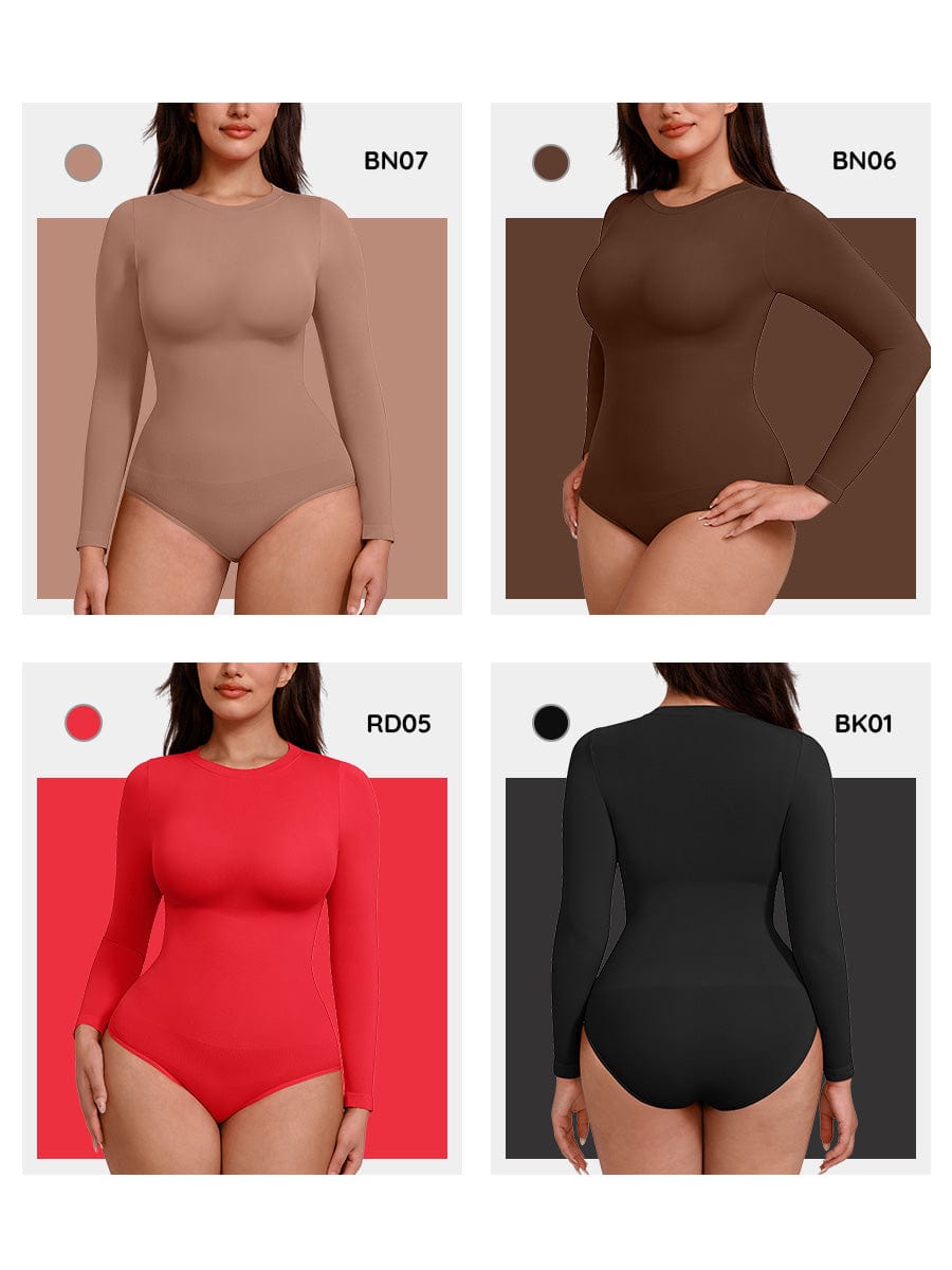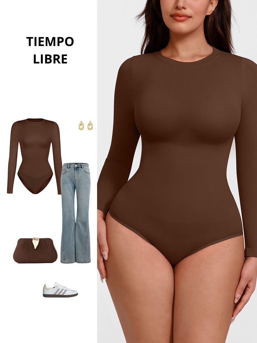 Body de manga larga con cuello redondo y sin costuras, control de abdomen, entrepierna a presión